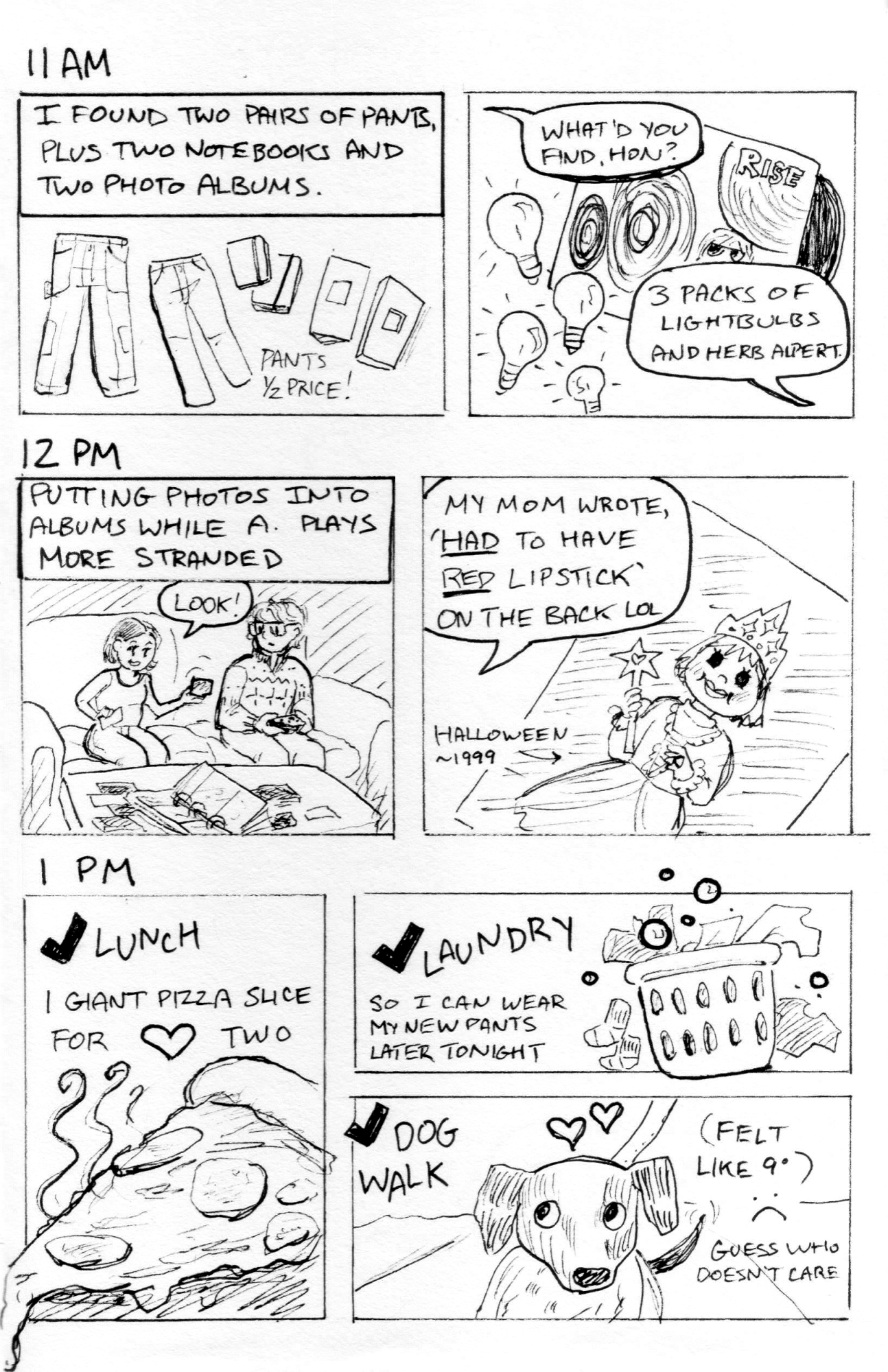 11 AM Panel 1: I found two pairs of pants, plus two notebooks and two photo albums. Pants half price! Panel 2: - What'd you find, hon? - Three packs of lightbulbs and Herb Alpert. 12 PM Panel 1: Putting photos into albums while A plays more Stranded. - Look! Panel 2: Halloween, ~1999 - My mom wrote, 'HAD to have RED lipstick' on the back lol' 1 PM Panel 1: Lunch; One giant pizza slice for two Panel 2: Laundry; so I can wear my new pants tonight. Panel 3: Dog walk; felt like 9 degrees (guess who doesn't care)ALT text for 11 AM, 12, 1 PM: