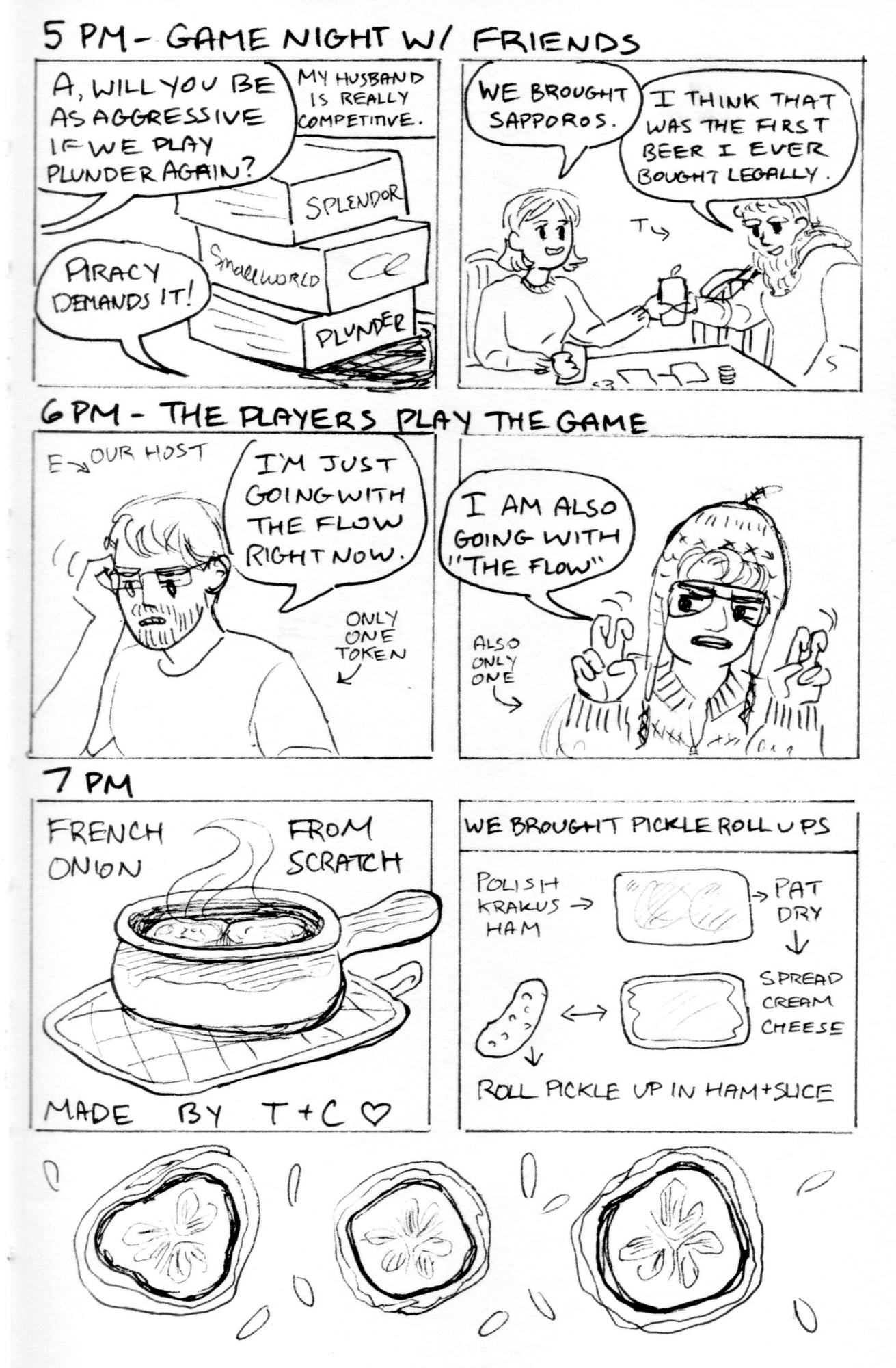 5 PM Game Night with Friends Panel 1: - A, will you be as aggressive if we play Plunder again? My husband is really competitive. - Piracy demands it! Panel 2: - We brought Sapporos. - I think that was the first beer I ever bought legally. 6 PM The Players Play the Game Panel 1: E, our host; only one token - I'm just going with the flow right now. Panel 2: - I am also "going with the flow". Also only one 7 PM Panel 1: French onion from scratch made by T + C Panel 2: We brought pickle roll ups. Polish Krakus Ham, pat dry, spread cream cheese, roll pickle up in ham and slice.ALT text for 5, 6, 7 PM: